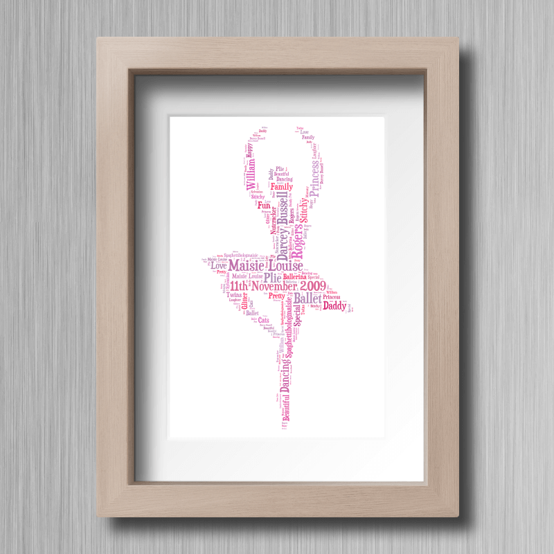 Looking for a unique gift for a family member or friend who enjoys ballet? Or maybe it is for someone who is a ballet dancer themselves. Then this word cloud gift is an ideal present using your own choice of words and colours.