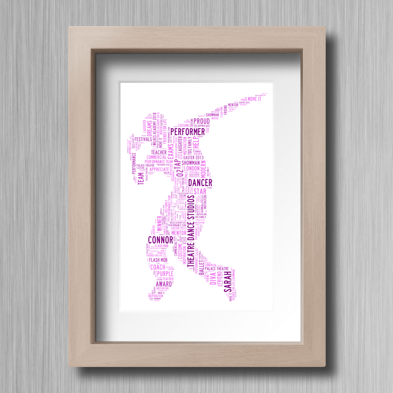 If you are looking for an ideal present for a dancer or maybe a dance teacher then here is a fairly recent design added to my dance category which makes for a perfect personalised word cloud gift. You can make this design totally unique by using your own choice of words and colours.