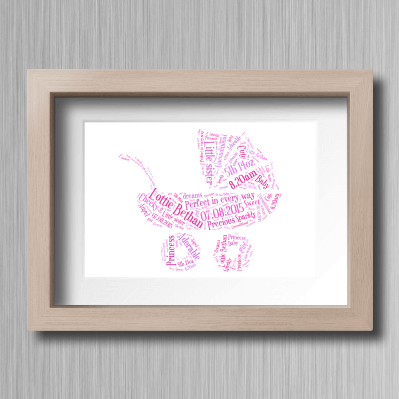 This design makes a great gift for new parents. If you are wondering what you can give as a present to a friend or family member who has just become a mum or dad then look no further. This word cloud design in the shape of a pram makes an ideal gift.